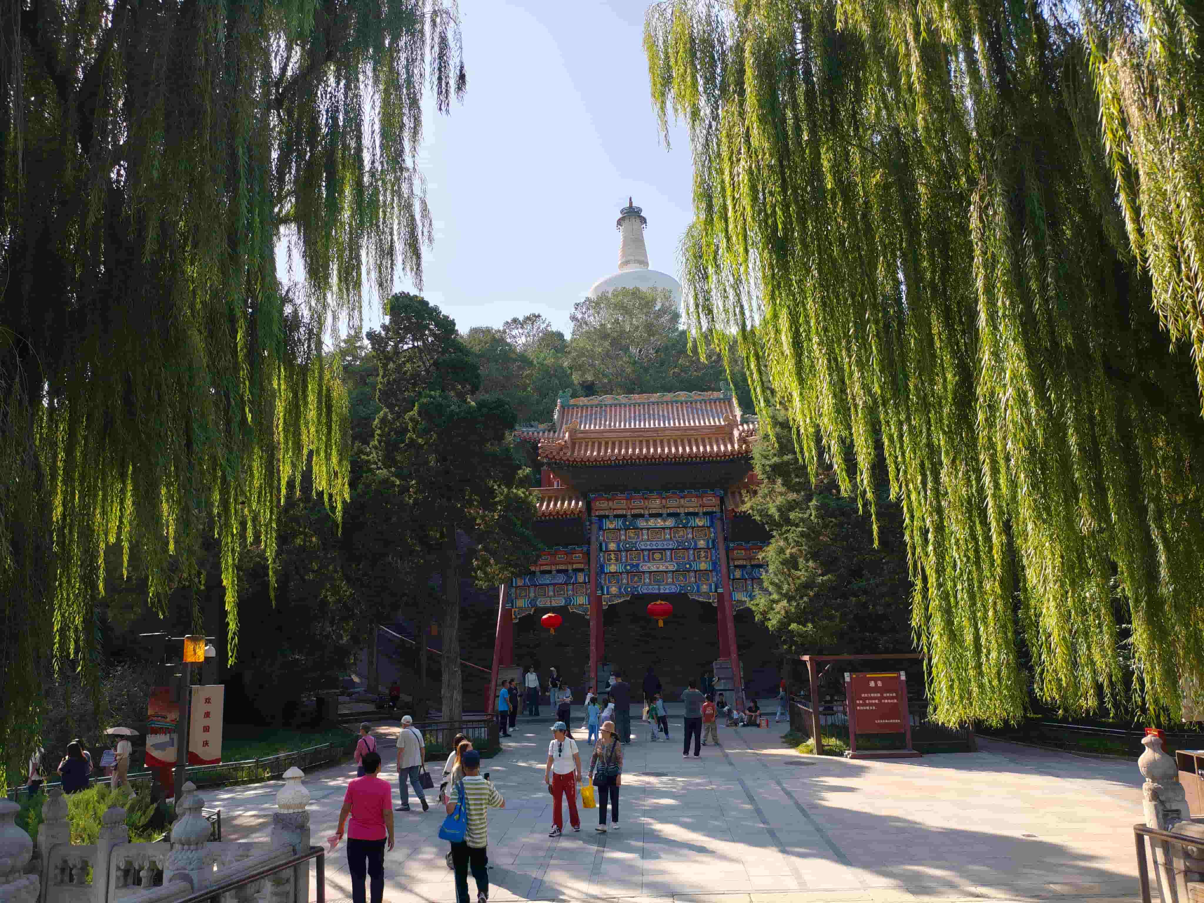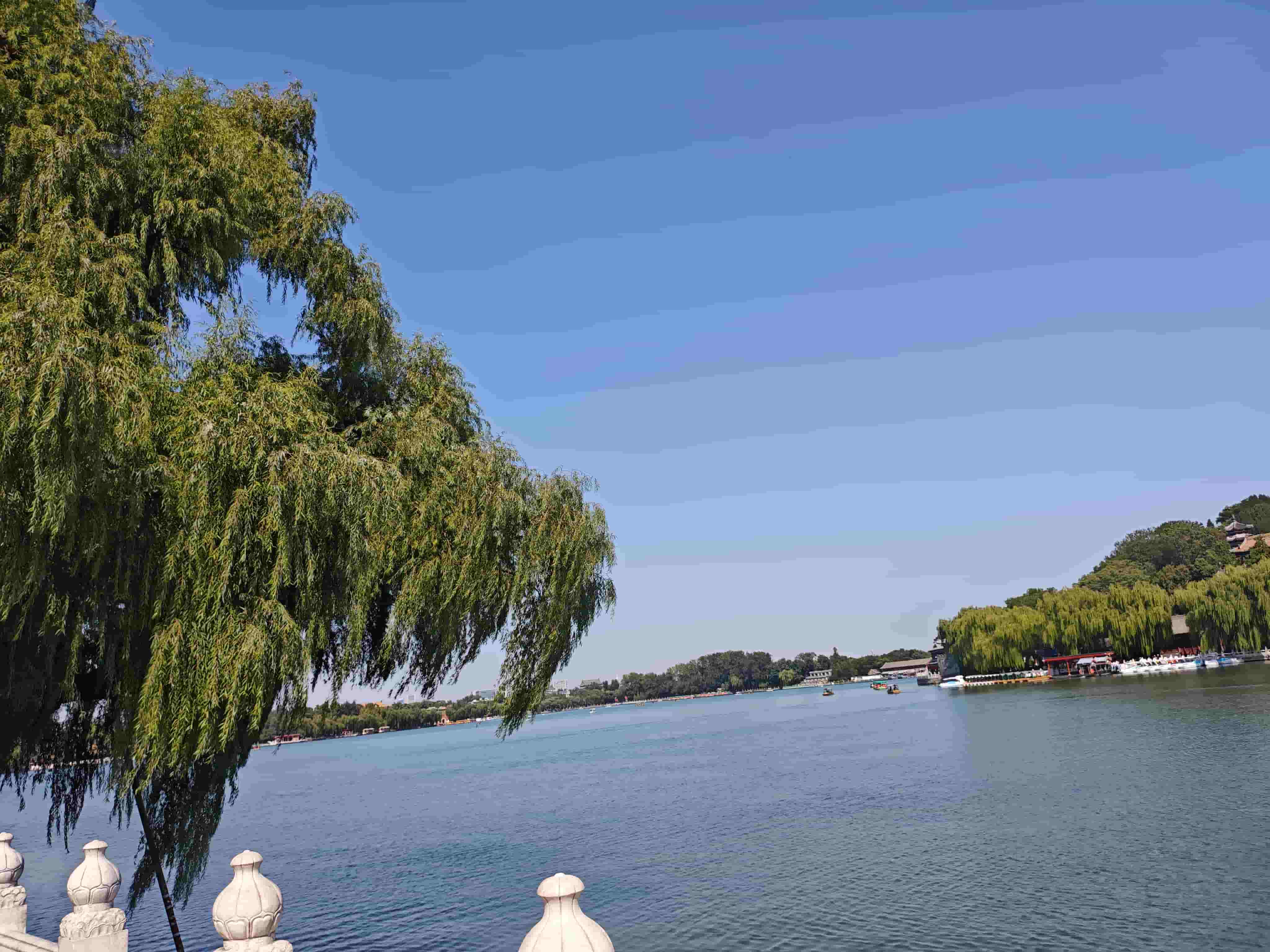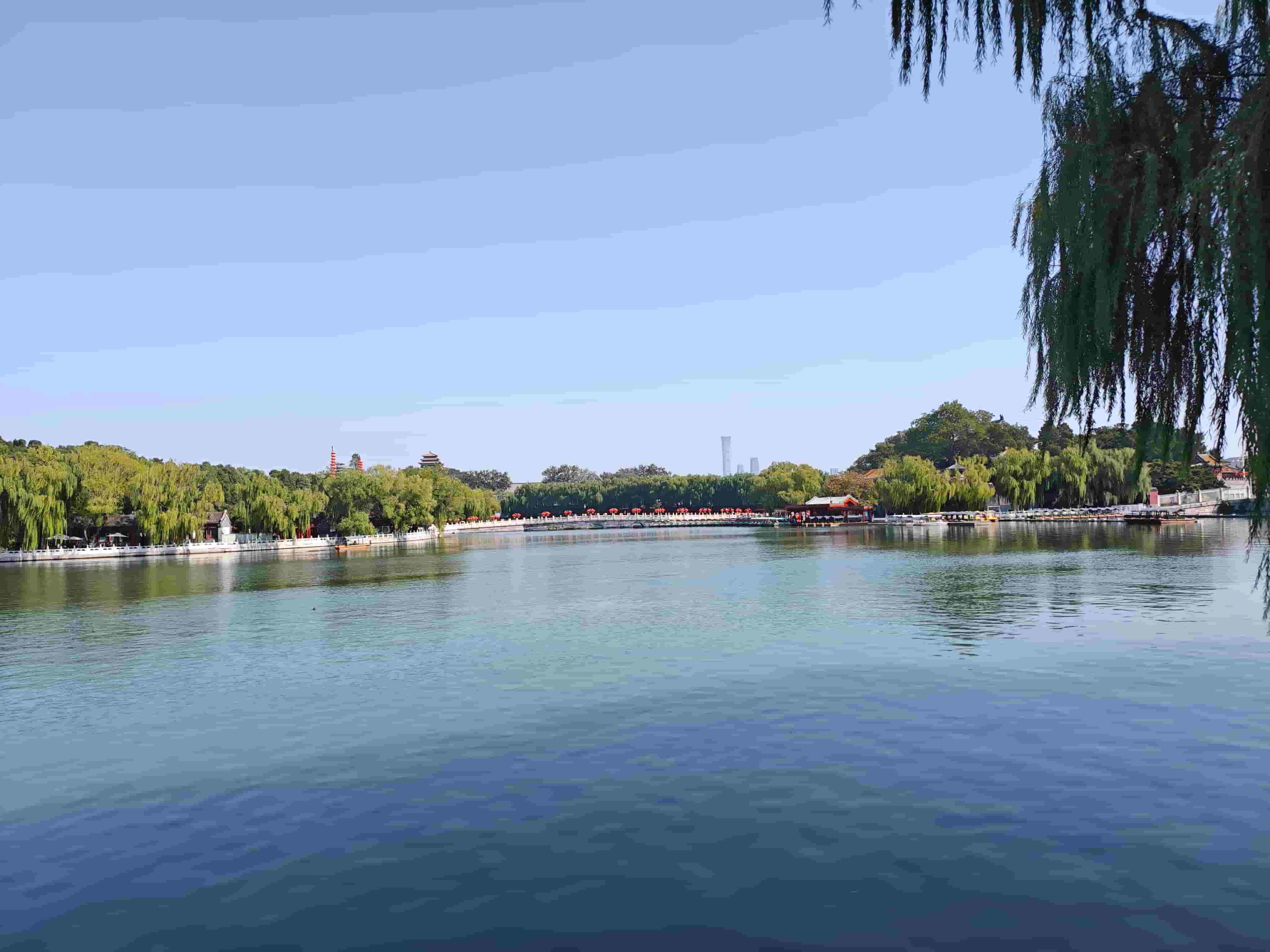 进入公园的第一眼还是比较震惊的,皇家园林就是不一样。因为文化水平有限,就去网上搜了一句诗。柳岸风轻翻画扇,徜徉美景醉弗还。《七律·北海秋颂》中的这句诗,形容了秋风轻拂柳岸,柳丝飘动如打开的画扇,游人沉醉于美景之中流连忘返。
